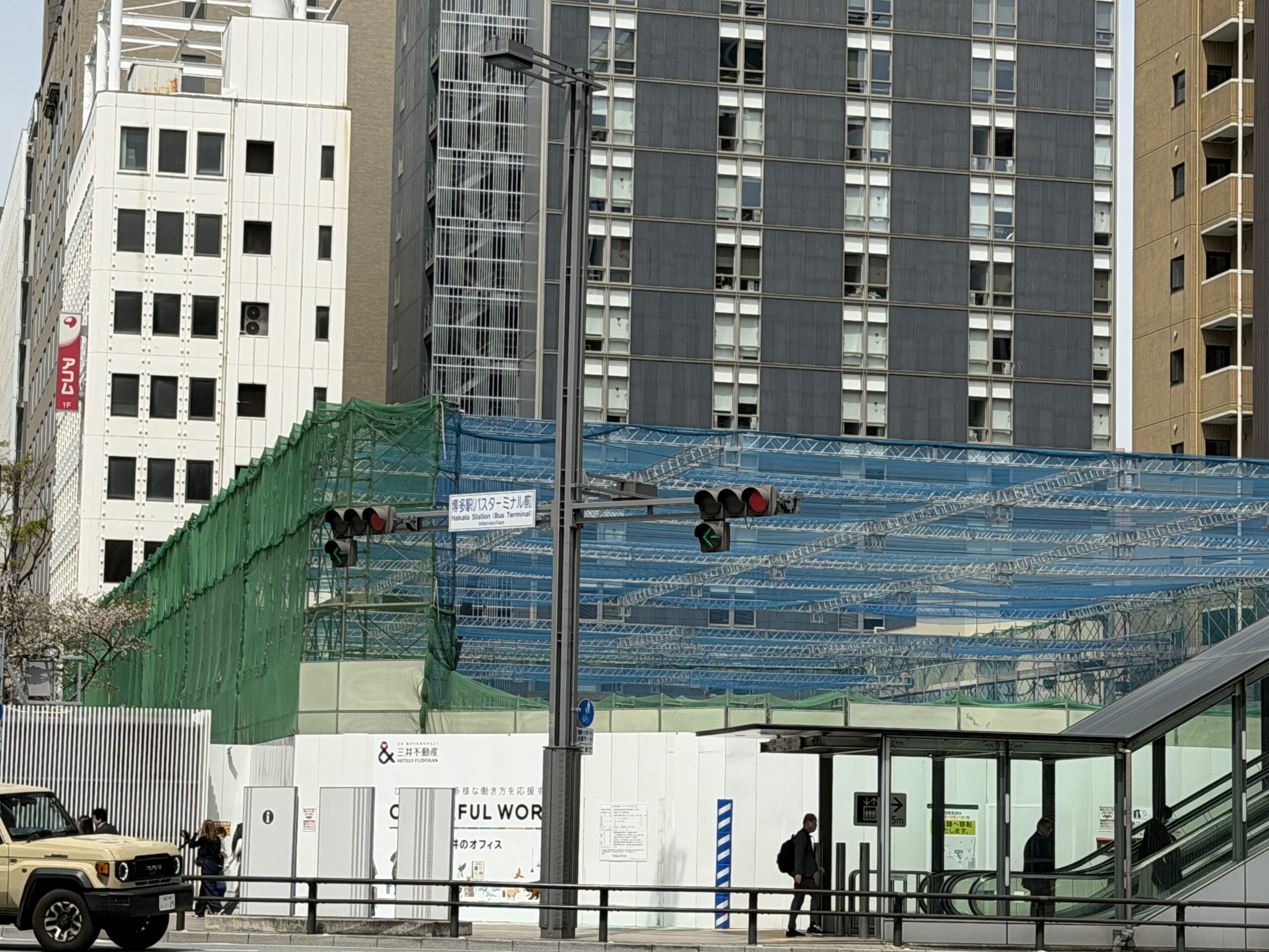 走出博多口,沿大博通方向便可看到拆除與建設的工地現場。目前正在拆除的是「博多新三井大廈」。由三井不動產主導,預計在原址興建備有辦公室與商業設施的新大樓。都市更新的浪潮,至今仍在持續推進之中。